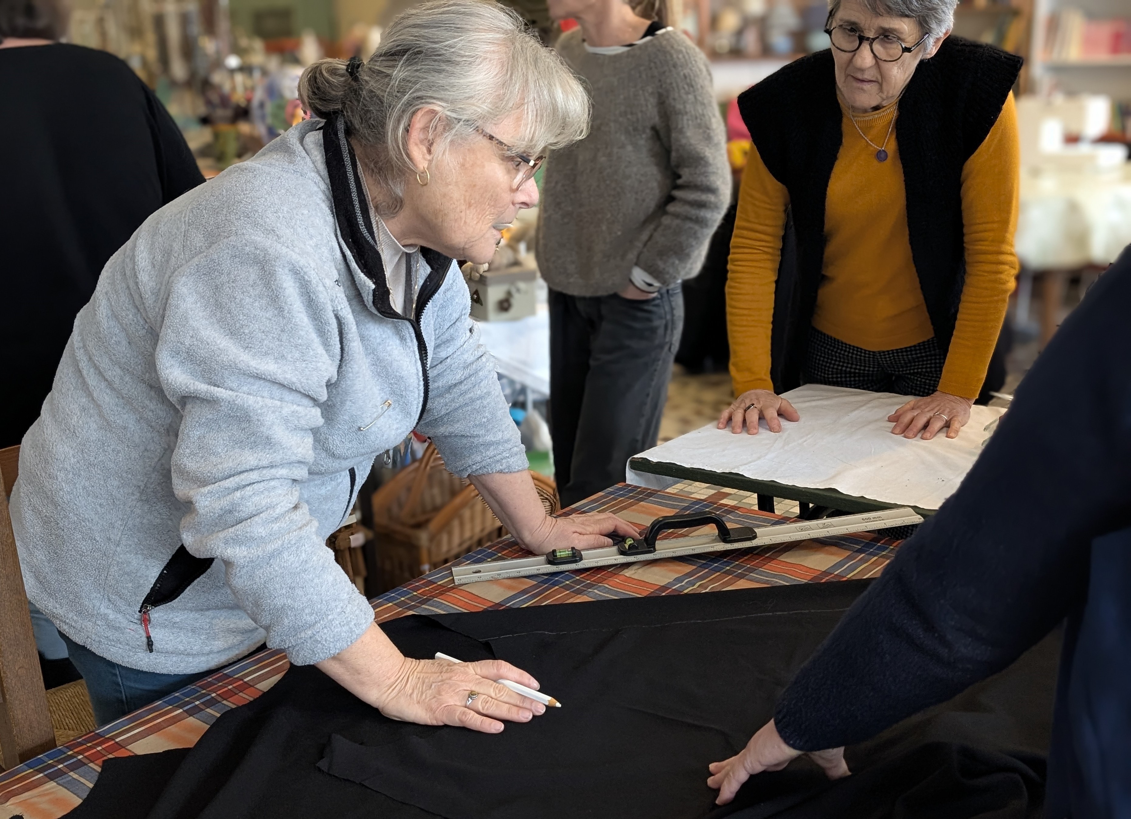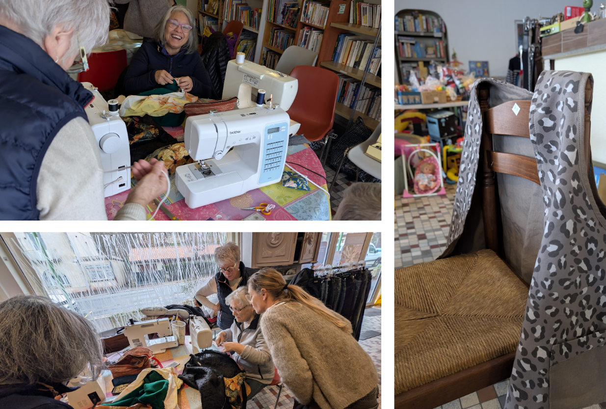 Elles sont une petite dizaine aujourd’hui, en général plutôt six, huit. Ce ne sont que des femmes, entre quarante et soixante-dix ans peut-être, un peu plus, un peu moins, je n’ai pas demandé. Je connais seulement le prénom de l’organisatrice / maîtresse couture, Yolande. C’est elle qui gravite pendant quelques heures, tous les mardis, autour de ces femmes et de leurs machines à coudre. Beaucoup sont clientes de la boutique et ont entendu parler de l’atelier par le bouche-à-oreille. Il y a aussi quelques bénévoles.