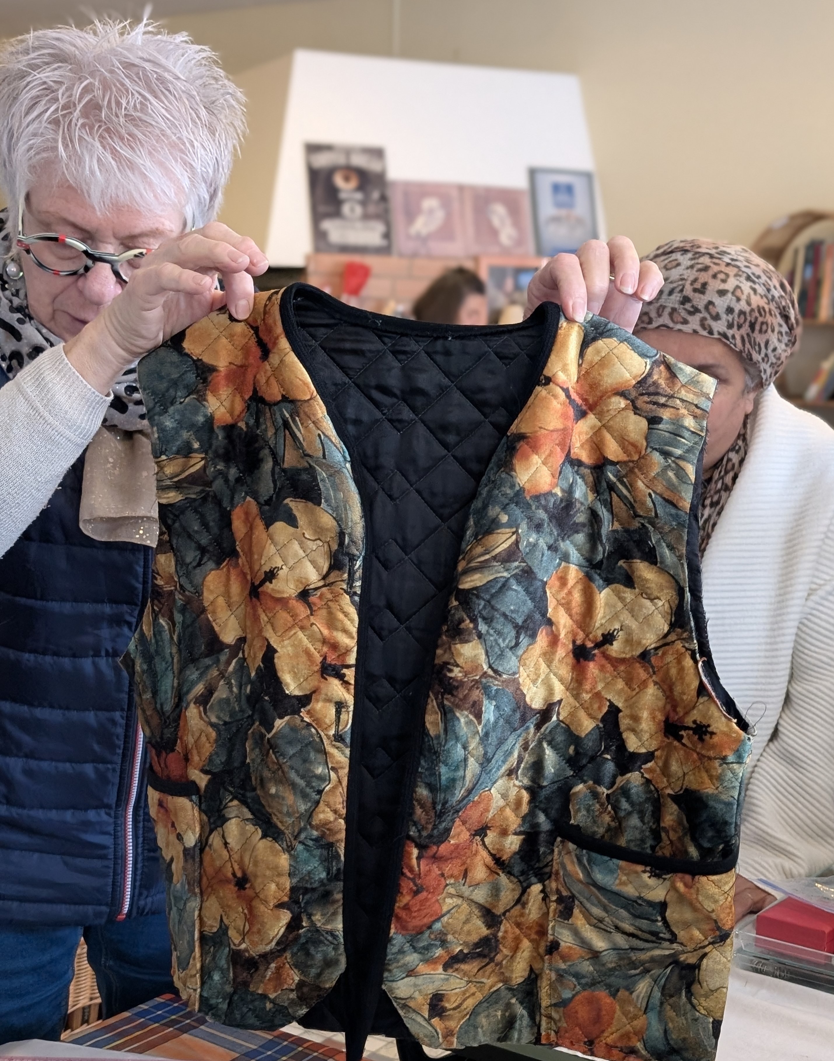 Aujourd’hui, elles fabriquent un gilet sans manches. Elles en sont à la quatrième étape : d’abord il y a eu les patrons, puis la découpe, et là ça fait deux séances qu’elles cousent vraiment. La pièce est vaste, un peu en désordre.